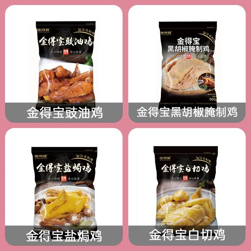 金得寶,廣東得寶食品有限公司擁有省農業產業化重點龍頭企業、省農產品出口示范基地、省菜籃子基地、粵港澳大灣區“菜籃子”產品加工企業等多個榮譽稱號。主營產品白切雞、鹽焗雞、豉油雞等各類家禽預制菜產品。