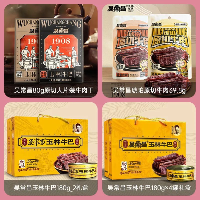 吳常昌始創于1908年。是廣西玉林市歷史悠久最負盛名的牛巴品牌。工藝傳承自南宋。精選牛后腿肉,獨家秘方烹制而成,色似咖啡,美味甘香,風味獨特。