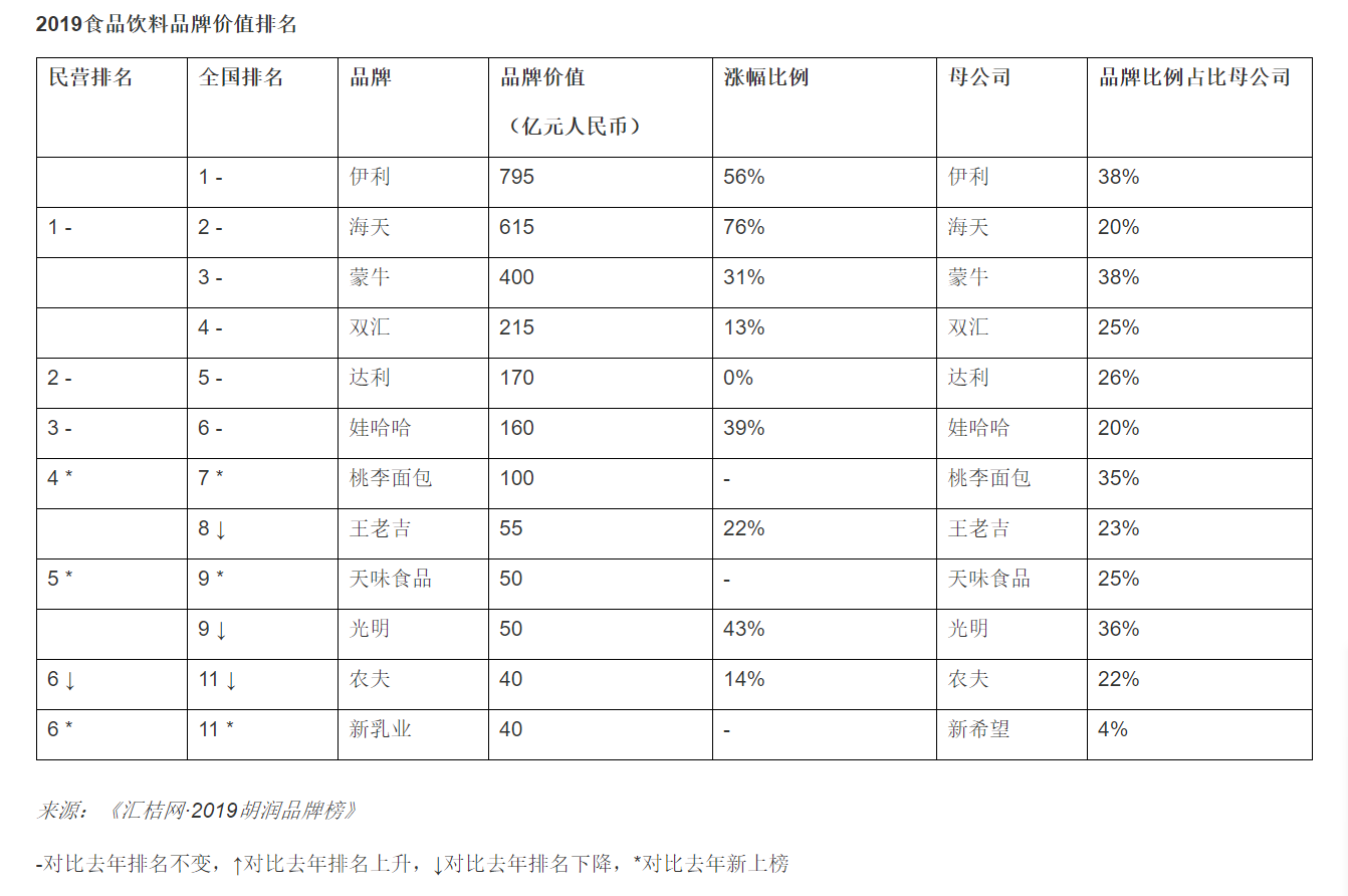 近日,胡潤研究院聯(lián)合匯桔網(wǎng)發(fā)布《匯桔網(wǎng)·2019胡潤品牌榜》,評出了最具價值的中國本土品牌200強,貴州茅臺以6400億元的品牌價值第二次成為“最具價值中國品牌”。在食品飲料榜單上,伊利蟬聯(lián)食品飲料行業(yè)冠軍,品牌價值比去年增長56%至795億元。海天與蒙牛仍排第二、第三名。食品飲料行業(yè)共有12個品牌上榜(去年為10個),其中7個為民營品牌。食品飲料行業(yè)上榜品牌的品牌價值總和占整張榜單的3%。廣東,內(nèi)蒙古,浙江和四川是食品飲料行業(yè)上榜品牌最多的地區(qū),各有2個品牌上榜。