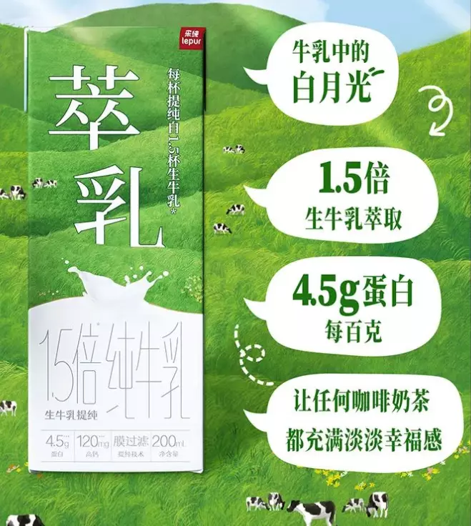 據介紹,萃乳由1.5倍生牛乳萃取,采用的是膜過濾提純技術,濃縮牛奶中的蛋白和鈣,優化掉多余的脂肪和鈉。每100g含有4.5g的蛋白,可搭配奶茶咖啡飲用。