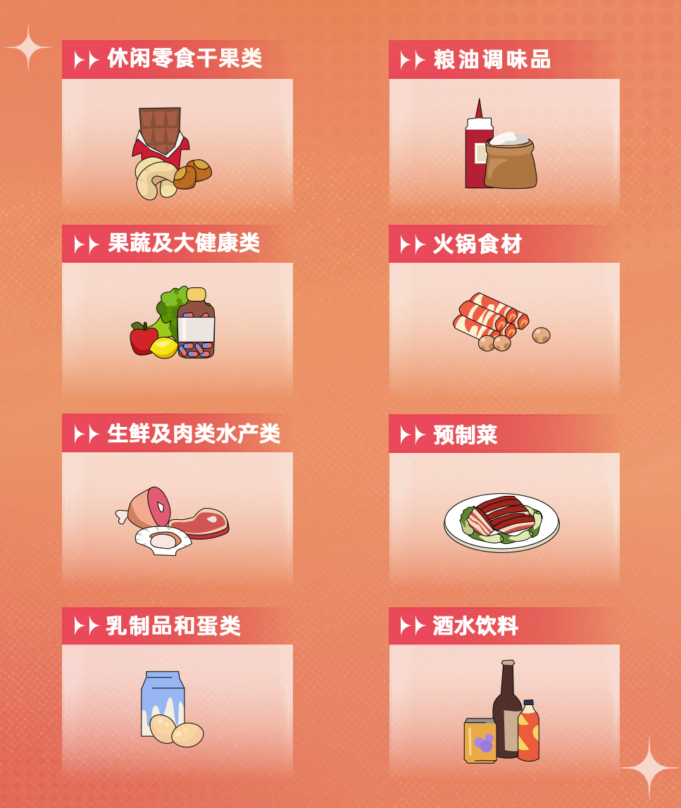 本次線上供需對接以食飲年貨采購為基礎(chǔ)需求,并結(jié)合當下市場消費熱點,打造8大年貨品類:休閑零食干果類、果蔬及大健康類、生鮮及肉類水產(chǎn)類、乳制品及蛋類、糧油調(diào)味品類、火鍋食材、預(yù)制菜以及酒水飲料,基本覆蓋全場景采購需求。