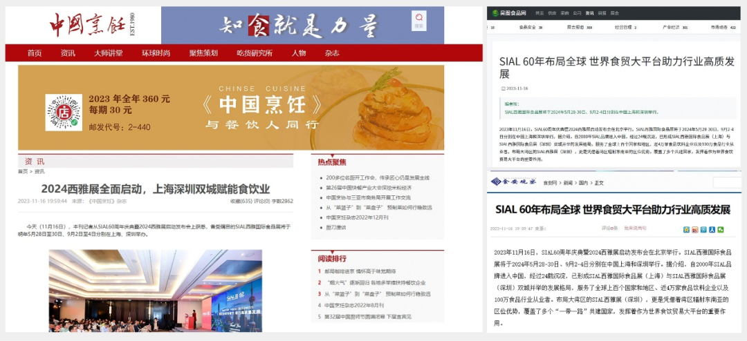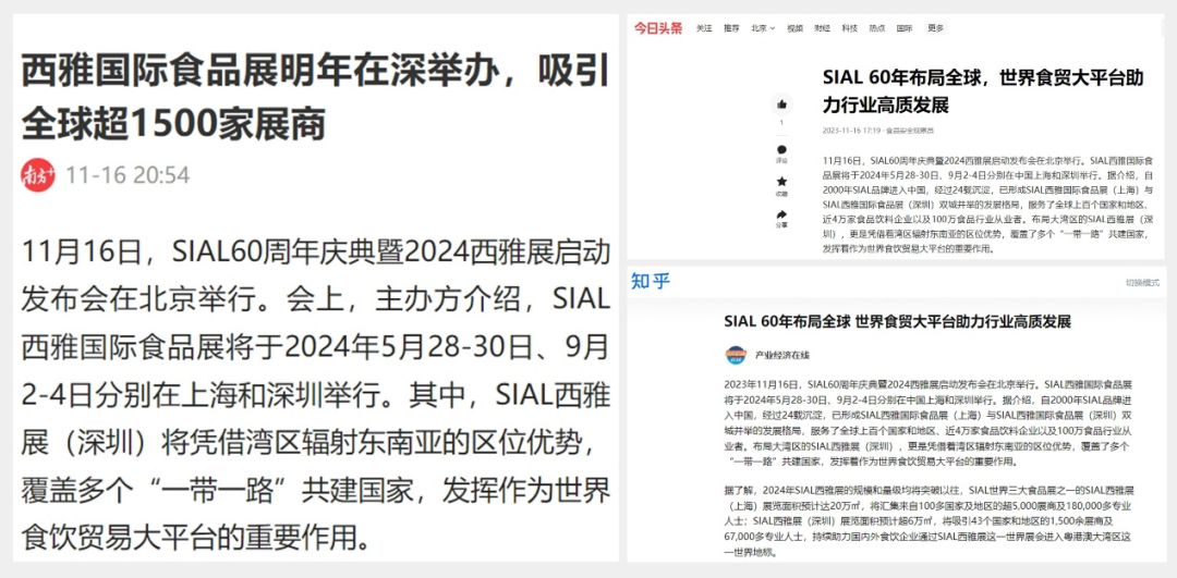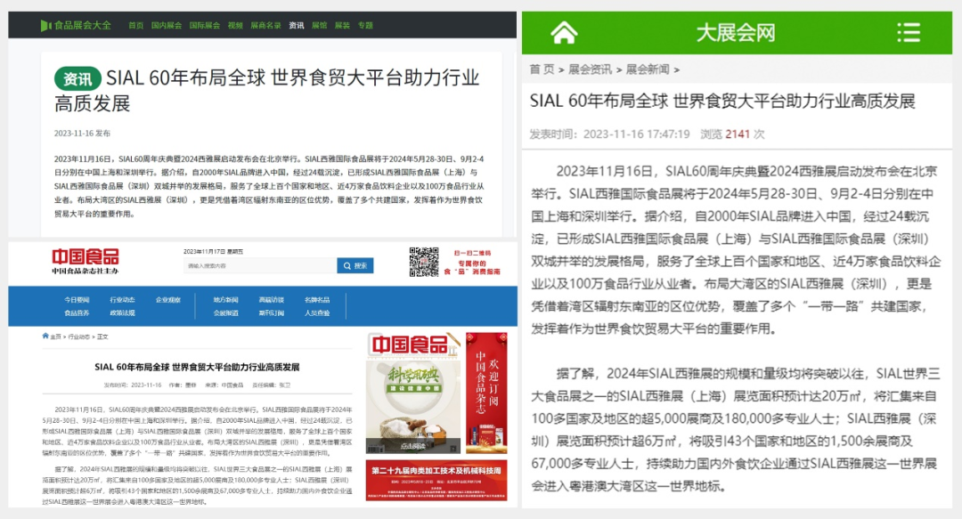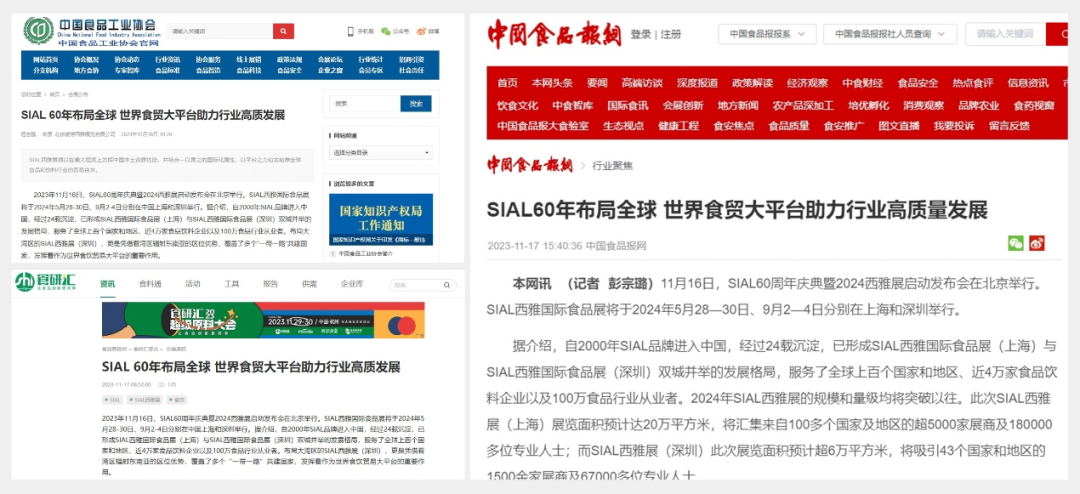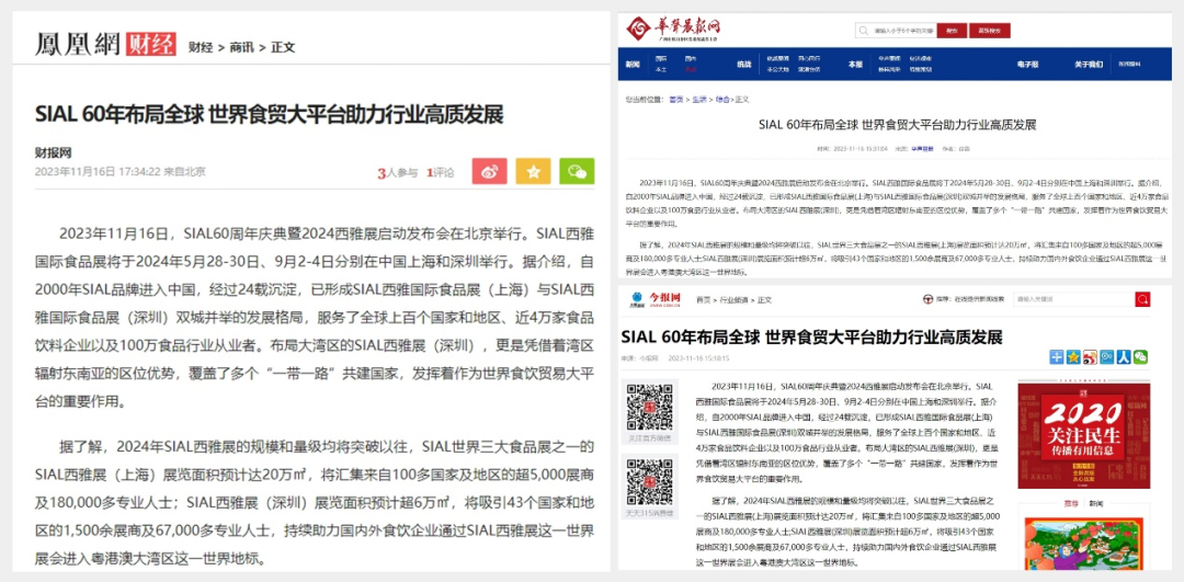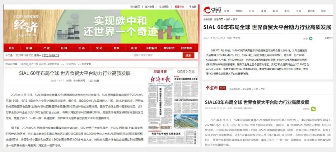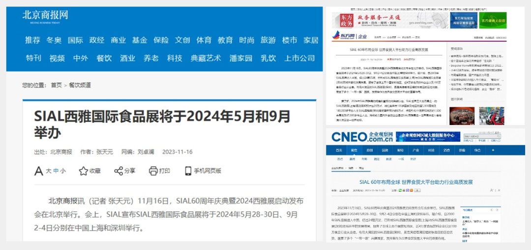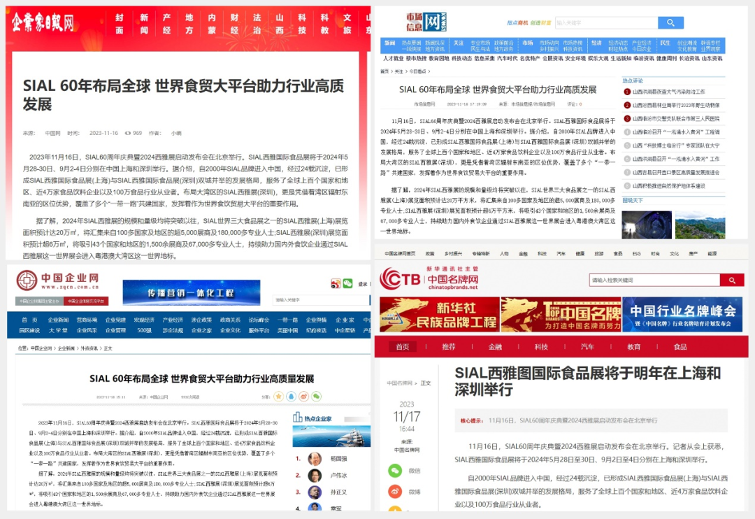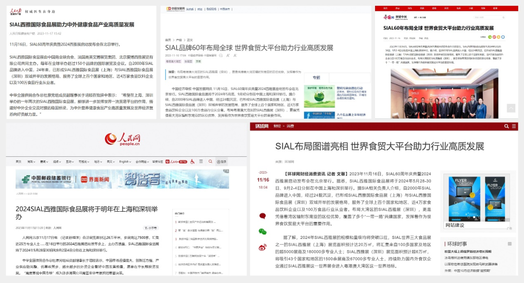 11月16日,SIAL60周年慶典暨2024西雅展啟動發布會在京舉行。隨后一條題為“SIAL 60年布局全球 世界食貿大平臺助力行業高質發展”的消息迅速被新華網、人民網、環球網、CHINA DAILY等主流官媒以及一眾行業媒體競相報道,百余媒體強勢聚焦,SIAL西雅展影響力再破圈。