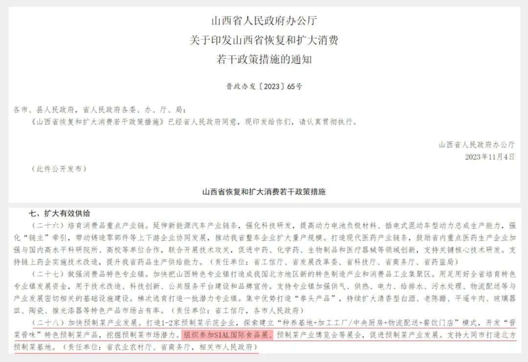 日前,山西省人民政府辦公廳出臺了《山西省恢復和擴大消費若干政策措施》,文件包括8大部分32條具體措施,以落實國家促銷費的政策要求。其中第七部分第3條重點提到“組織參加SIAL國際食品展……促進預制菜產業發展”。